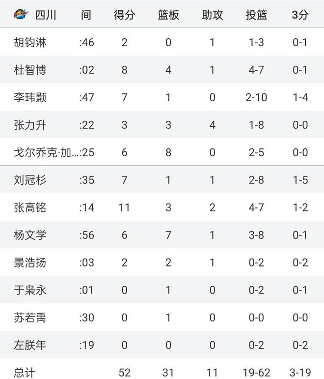 打上海,四川男籃全場(chǎng)得到52分,球隊(duì)以52:88大敗。而前幾天,他們輸?shù)母鼞K,那就是對(duì)陣北京男籃,那場(chǎng)比賽四川男籃被全方面壓制,首節(jié)就得到10分,次節(jié)更是只拿到6分,整個(gè)上半場(chǎng)球隊(duì)僅有16分入賬,比這次輸?shù)倪€要多,最終全隊(duì)40分鐘就拿到46分,被北京男籃狂拉51分(46:97)。四川男籃這賽季到底有多爛呢?數(shù)據(jù)顯示,這賽季7場(chǎng)比賽,他們7戰(zhàn)全負(fù),球隊(duì)0勝7負(fù)排名CBA積分榜倒數(shù)第一位,他們場(chǎng)均輸給對(duì)手25分之多,就連實(shí)力一般的同曦男籃都能贏他們接近30分。